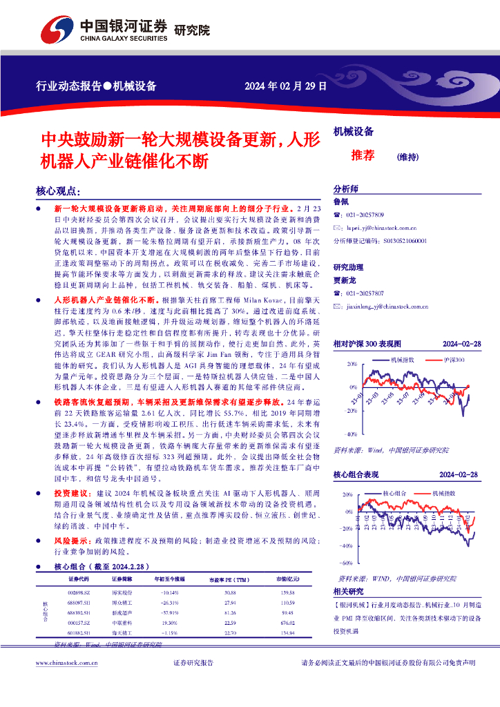 中国银河:机械设备行业动态报告:中央鼓励新一轮大规模设备更新,人形机器人产业链催化不断.pdf