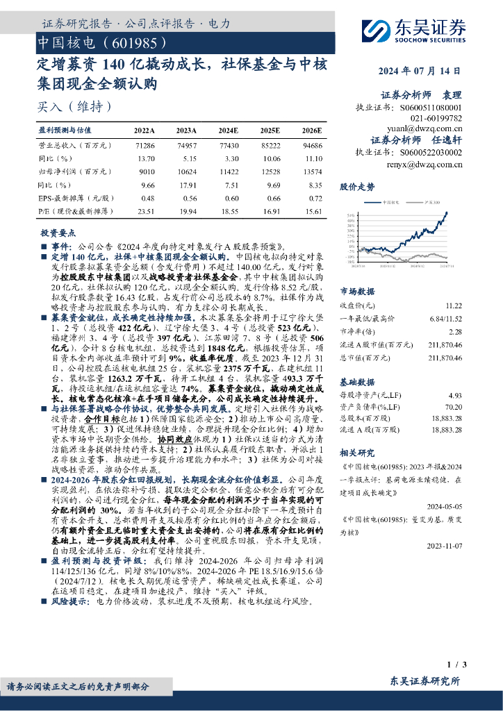 东吴证券:中国核电(601985)-定增募资140亿撬动成长,社保基金与中核集团现金全额认购.pdf