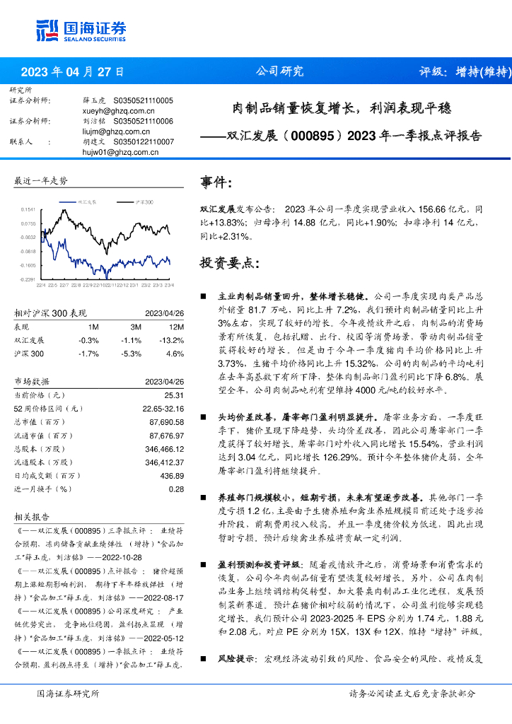 国海证券:双汇发展(000895)-2023年一季报点评报告:肉制品销量恢复增长,利润表现平稳.pdf