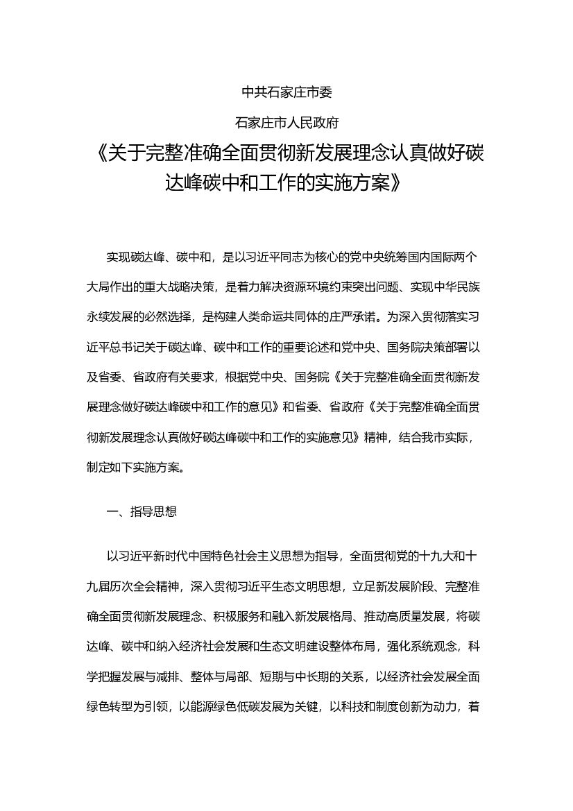 石家庄关于完整准确全面贯彻新发展理念认真做好碳达峰碳中和工作的实施方案.doc