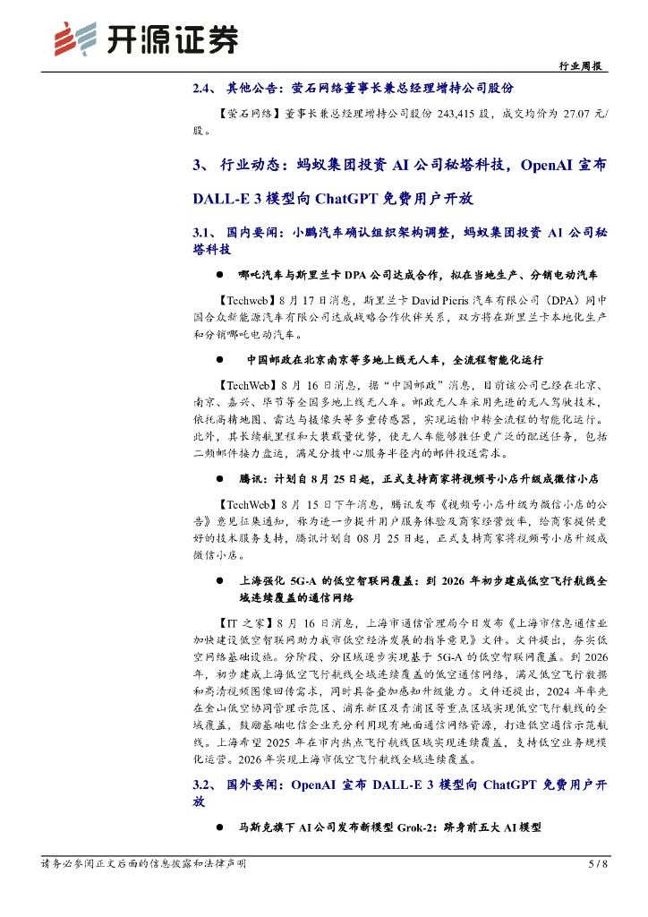 开源证券:电力设备行业周报:低空经济行业周报(第三十六期):中国移动主导首个低空经济共享设备标准立项,多地低空经济支持政