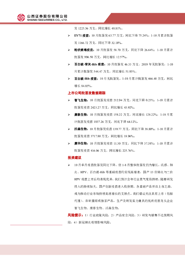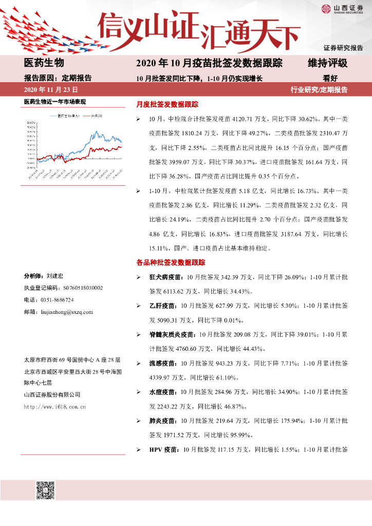 山西证券:2020年10月疫苗批签发数据跟踪:10月批签发同比下降,1-10月仍实现增长.pdf