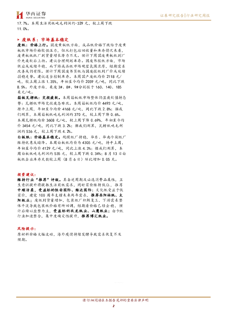 华西证券:造纸行业数据跟踪报告:木浆系行情整理,废纸系市场稳定;关注文化纸需求提升.pdf