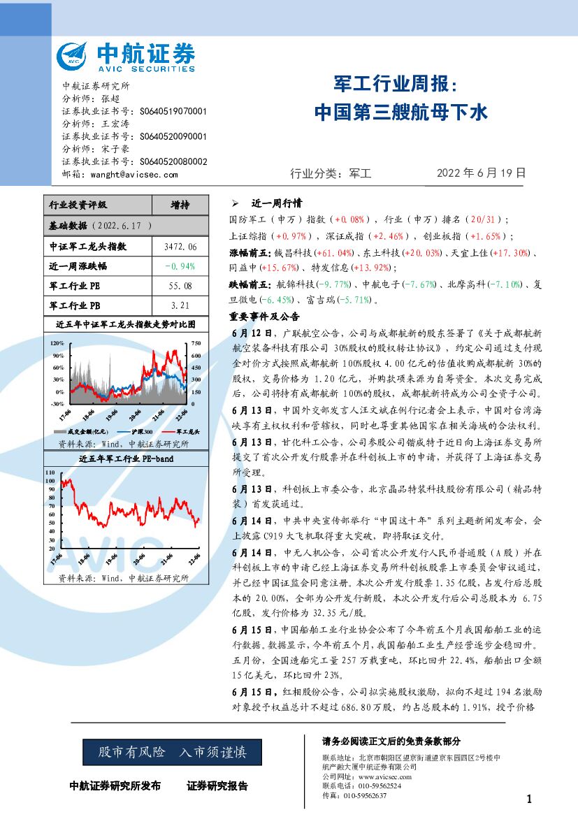 中航证券:军工行业周报:中国第三艘航母下水.pdf
