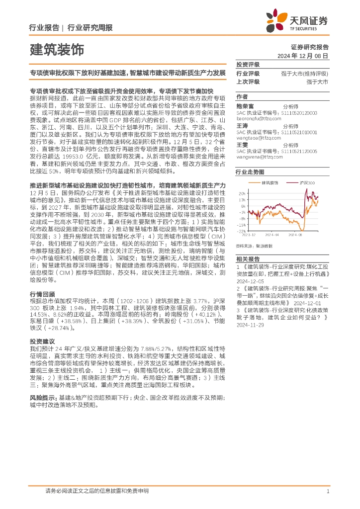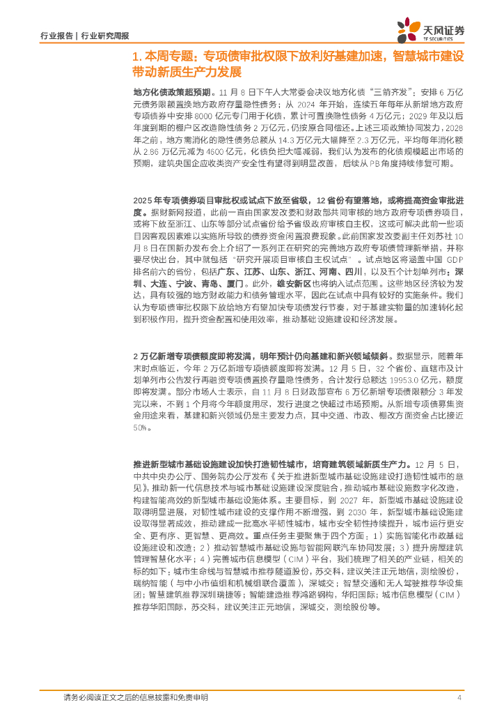 天风证券:建筑装饰行业研究周报:专项债审批权限下放利好基建加速,智慧城市建设带动新质生产力发展.pdf