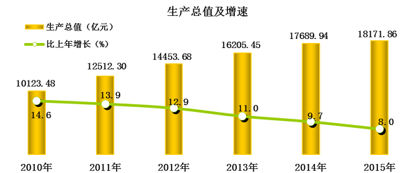 初步核算,全年生产总值18171.86亿元,比上年增长8.0%。其中,第一产业增加值1597.63亿元,增长5.1%,占生产总值的比重为8.8%;第二产业增加值9360.30亿元,增长7.3%,占51.5%;第三产业增加值7213.93亿元,增长9.6%,占39.7%。人均生产总值48023元,比上年增长7.6%。