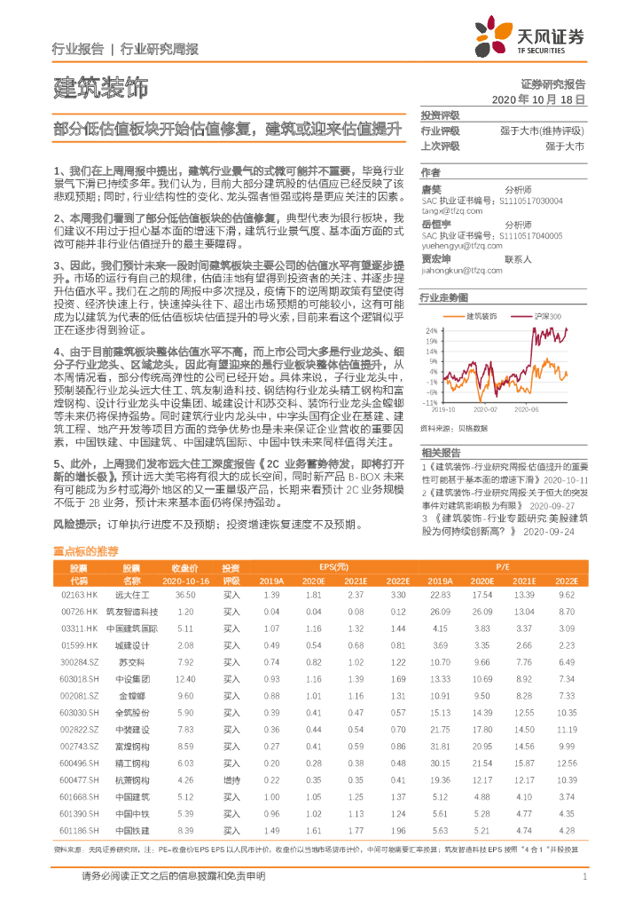 天风证券:建筑装饰行业研究周报:部分低估值板块开始估值修复,建筑或迎来估值提升.pdf