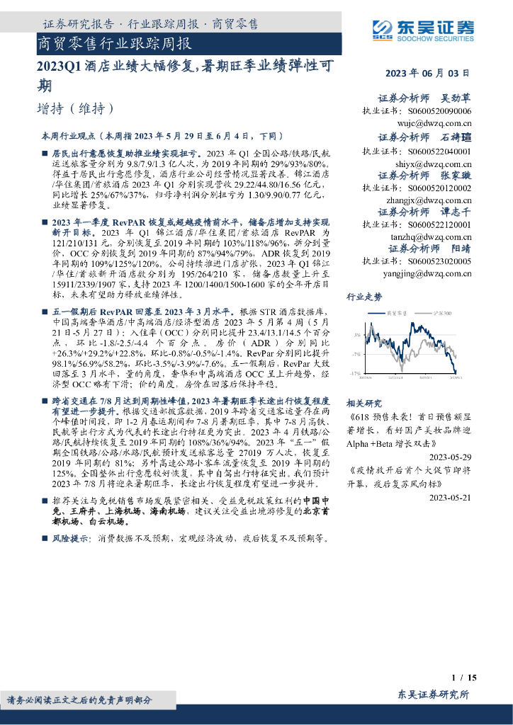 东吴证券:商贸零售行业跟踪周报:2023Q1酒店业绩大幅修复,暑期旺季业绩弹性可期.pdf