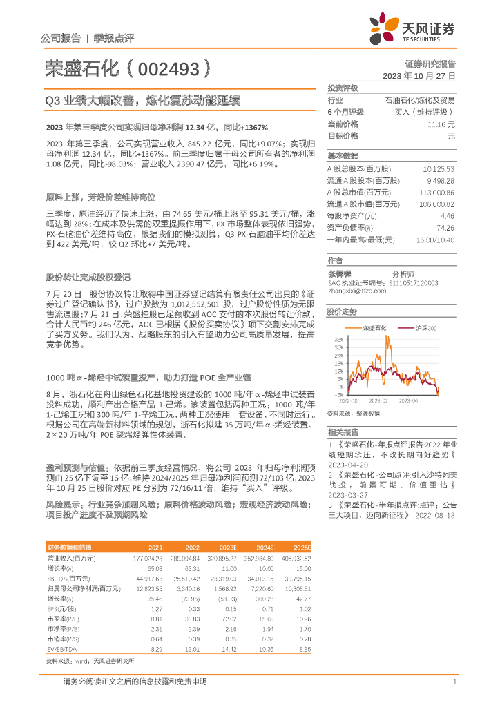 天风证券:荣盛石化(002493)-Q3业绩大幅改善,炼化复苏动能延续.pdf