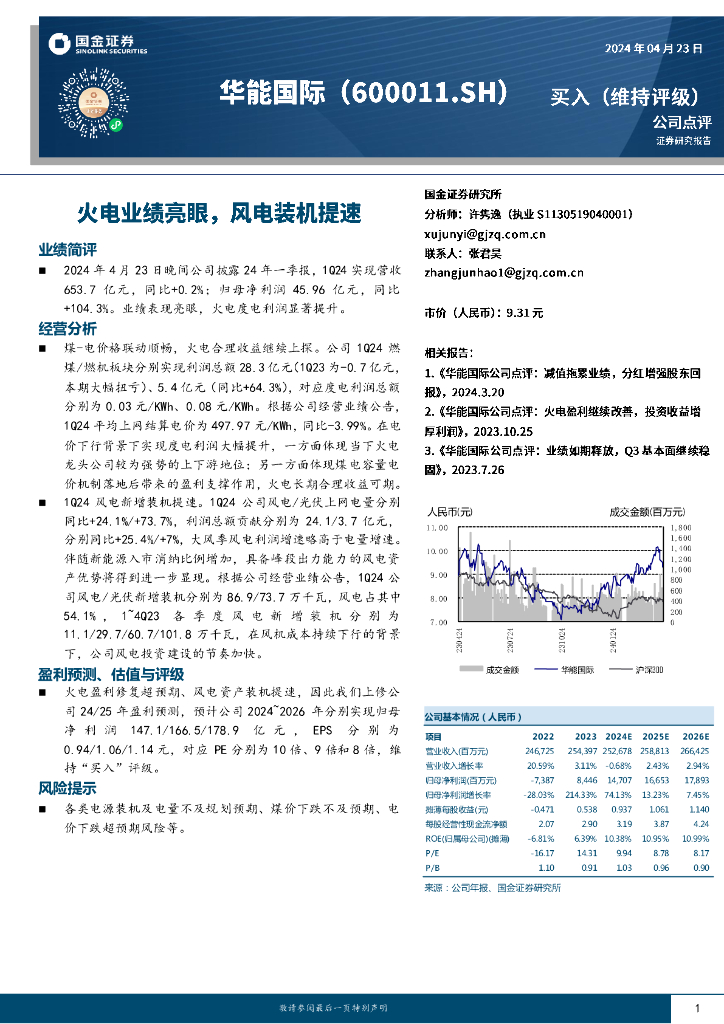 国金证券:华能国际(600011)-火电业绩亮眼,风电装机提速.pdf