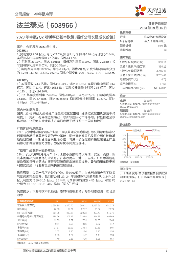 天风证券:法兰泰克(603966)-2023年中报:Q2毛利率已基本恢复,看好公司长期成长价值!.pdf