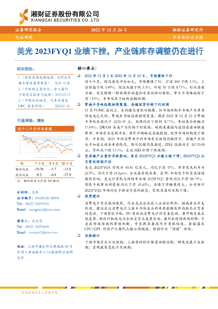 湘财证券:半导体行业月报:美光2023FYQ1业绩下挫,产业链库存调整仍在进行.pdf