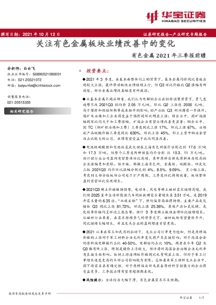 华宝证券:有色金属2021年三季报前瞻:关注有色金属板块业绩改善中的变化.pdf