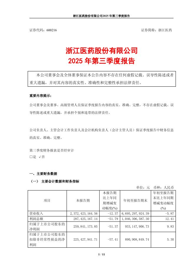 600216-浙江医药:浙江医药2025年第三季度报告.pdf