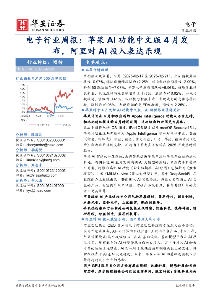 华安证券:电子行业周报:苹果AI功能中文版4月发布,阿里对AI投入表达乐观.pdf