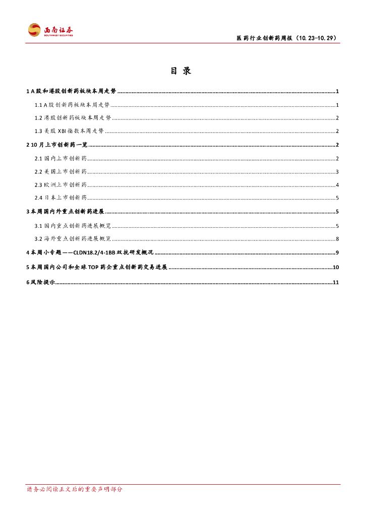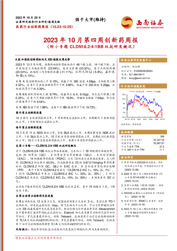 西南证券:医药行业创新药周报:2023年10月第四周创新药周报(附小专题CLDN18.2/4-1BB双抗研发概况).pdf