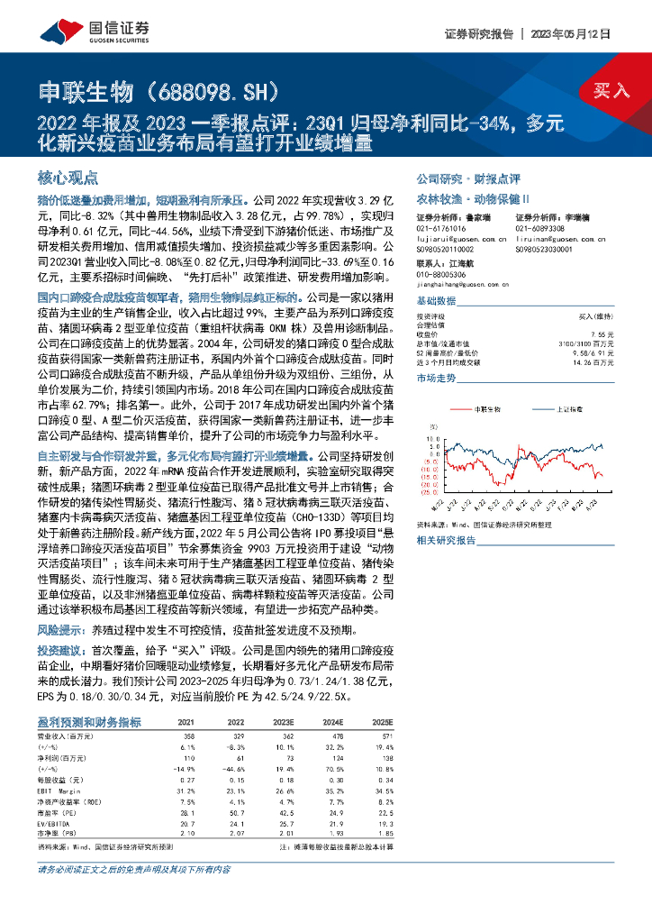 国信证券:申联生物(688098)-2022年报及2023一季报点评:23Q1归母净利同比-34%,多元化新兴疫苗业务布局有望打开业绩增量.pdf