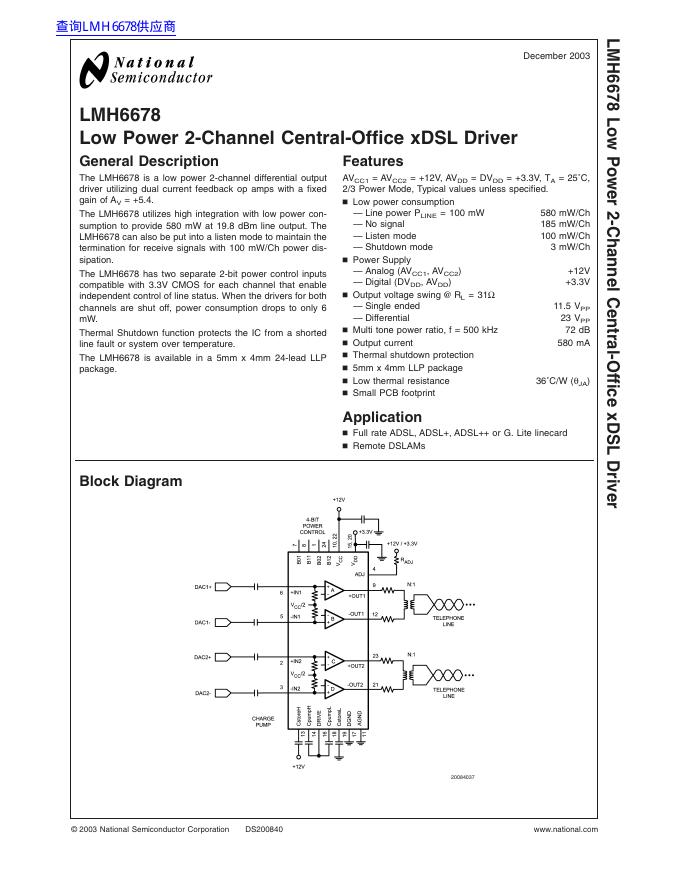 National Semiconductor LMH6678 Low Power 2-Channel Central-Office xDSL Driver 数据手册.pdf