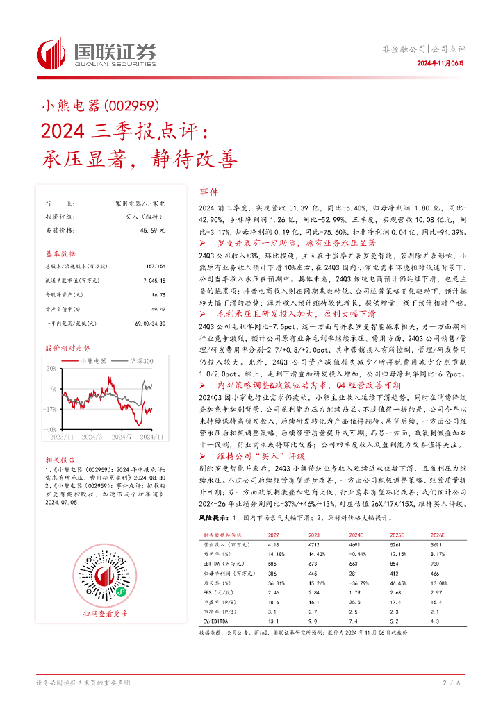 国联证券:小熊电器(002959)-2024三季报点评:承压显著,静待改善.pdf