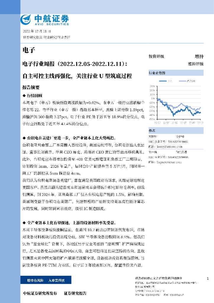 中航证券:电子行业周报:自主可控主线再强化,关注行业U型筑底过程.pdf