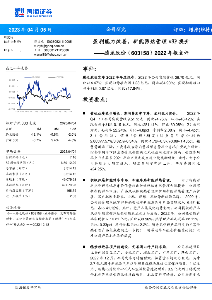 国海证券:腾龙股份(603158)-2022年报点评:盈利能力改善,新能源热管理ASP提升.pdf
