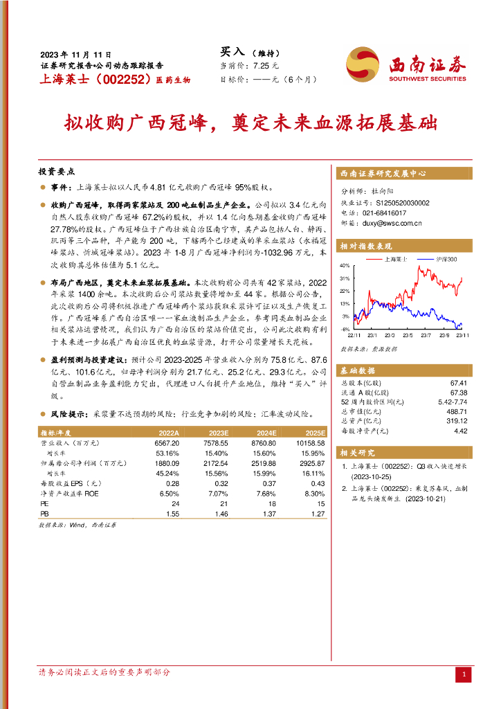 西南证券:上海莱士(002252)-拟收购广西冠峰,奠定未来血源拓展基础.pdf