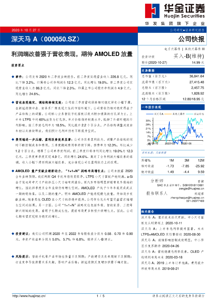 华金证券:深天马A(000050)-利润端改善强于营收表现,期待AMOLED放量.pdf