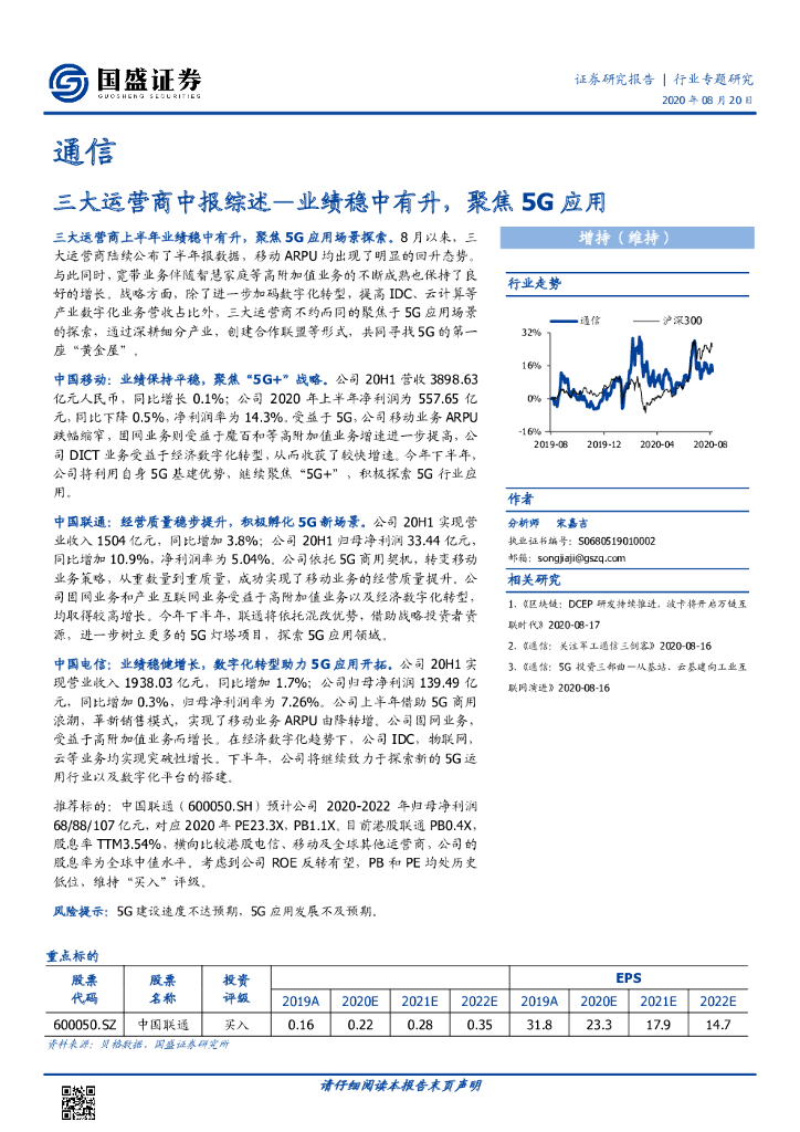 国盛证券:通信行业专题研究:三大运营商中报综述—业绩稳中有升,聚焦5G应用.pdf