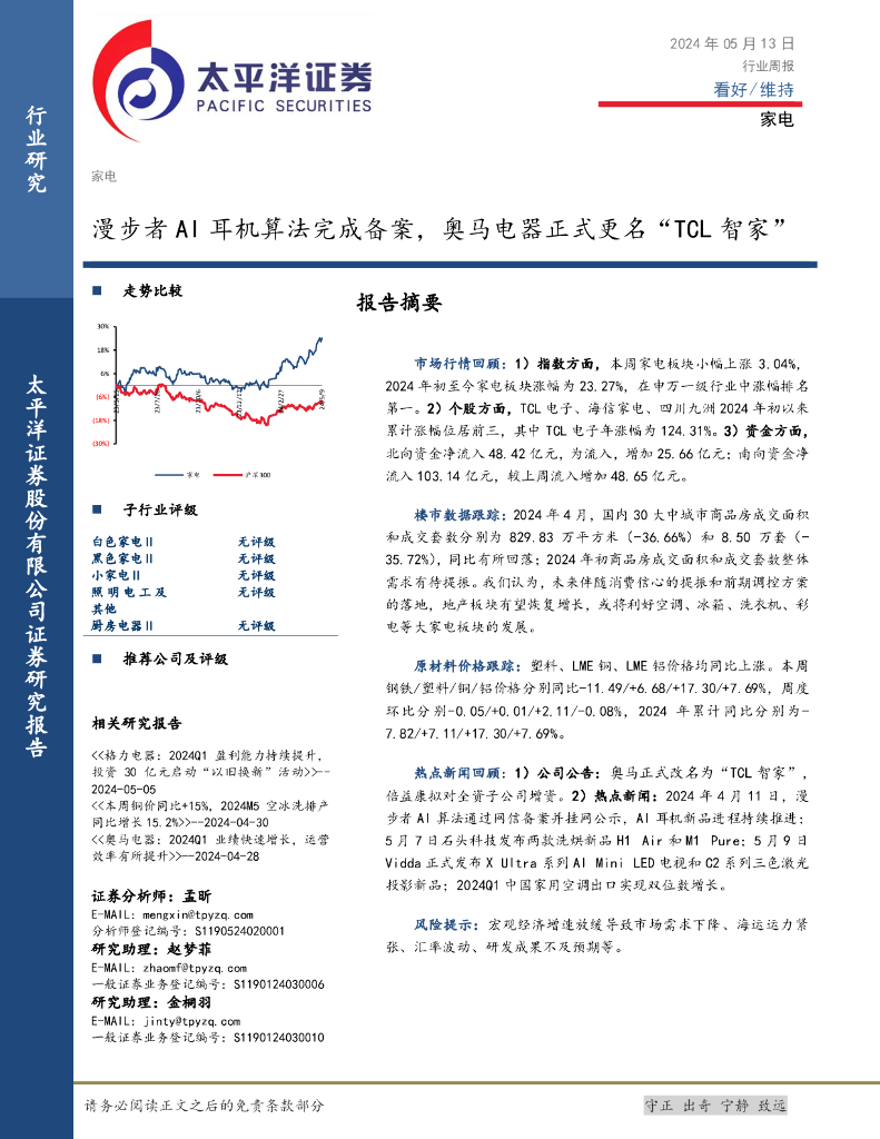 太平洋证券:家电行业周报:漫步者AI耳机算法完成备案,奥马电器正式更名“TCL智家”.pdf