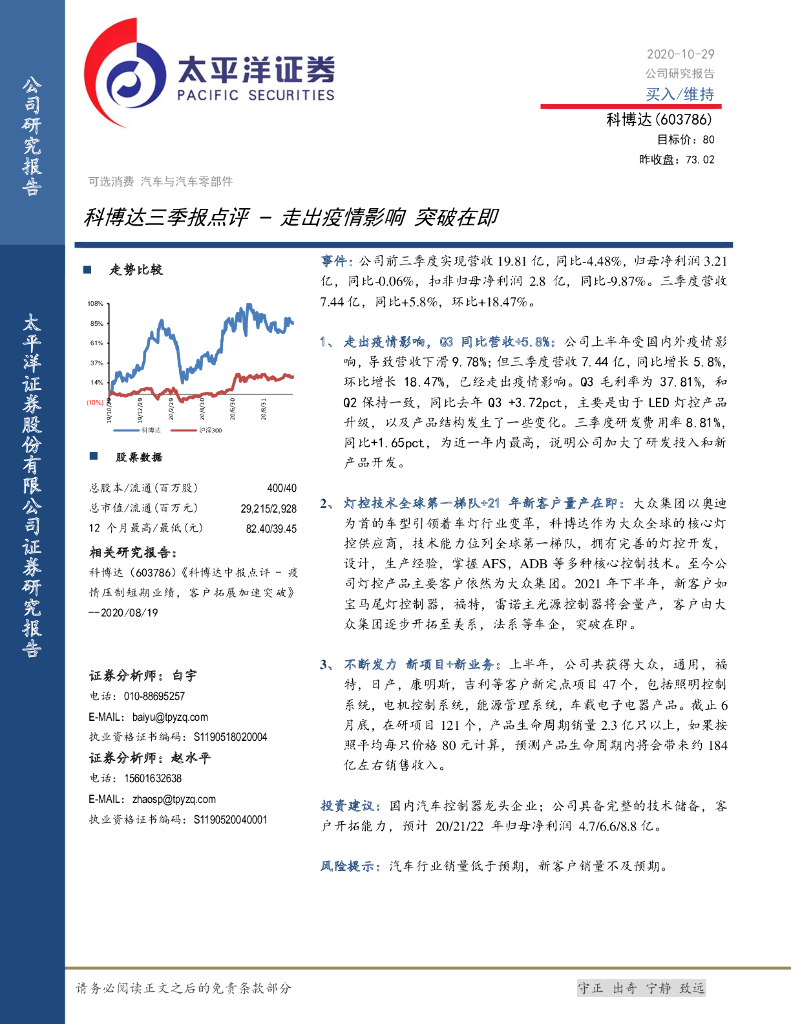 太平洋证券:科博达三季报点评– 走出疫情影响 突破在即.pdf