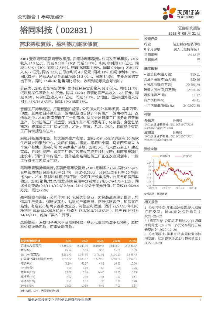 天风证券:裕同科技(002831)-需求持续复苏,盈利能力逐季修复.pdf