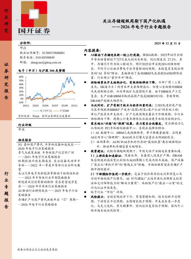 国开证券:2026年电子行业专题报告:关注存储超级周期下国产化机遇.pdf
