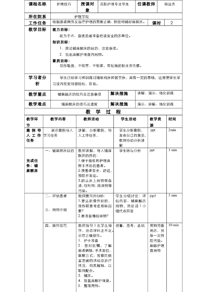 《护理技巧》电子教案-子任务三 铺麻醉床.pdf