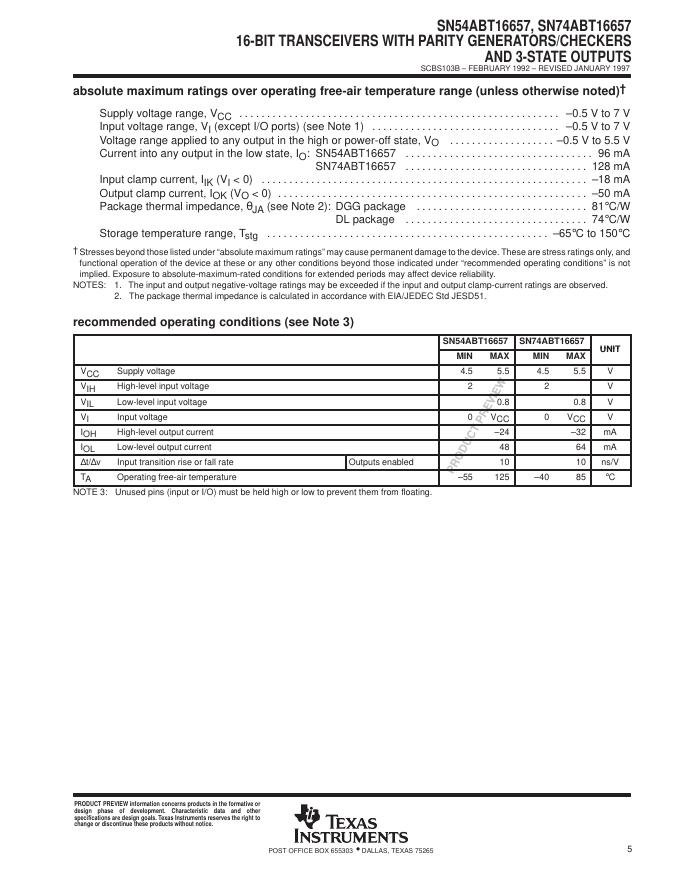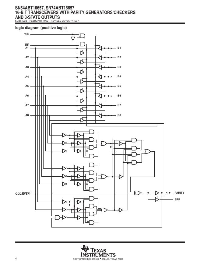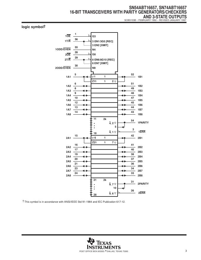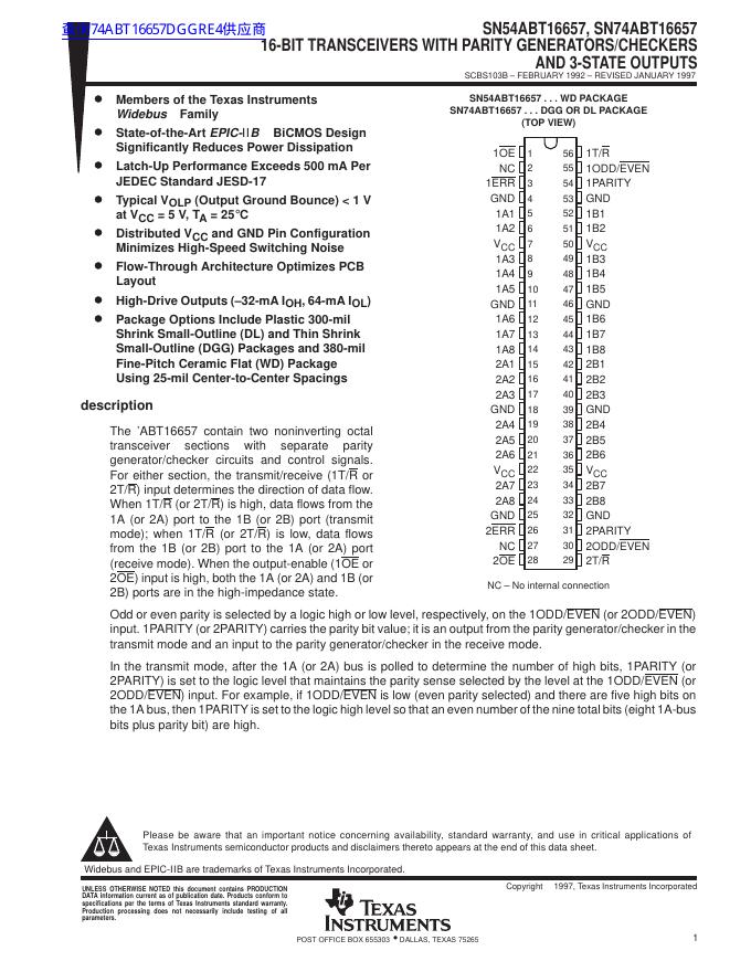 TEXAS INSTRUMENTS SN54ABT16657, SN74ABT16657 16-BIT TRANSCEIVERS WITH PARITY GENERATORS/CHECKERS AND 3-STATE OUTPUTS 数据手册.pdf