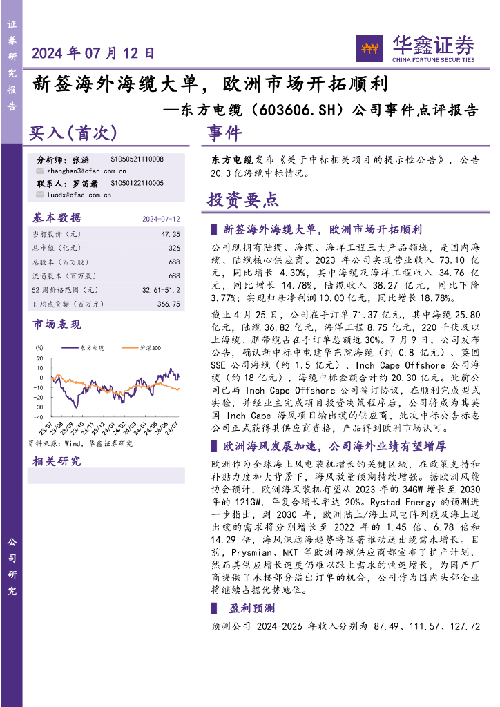 华鑫证券:东方电缆(603606)-公司事件点评报告:新签海外海缆大单,欧洲市场开拓顺利.pdf