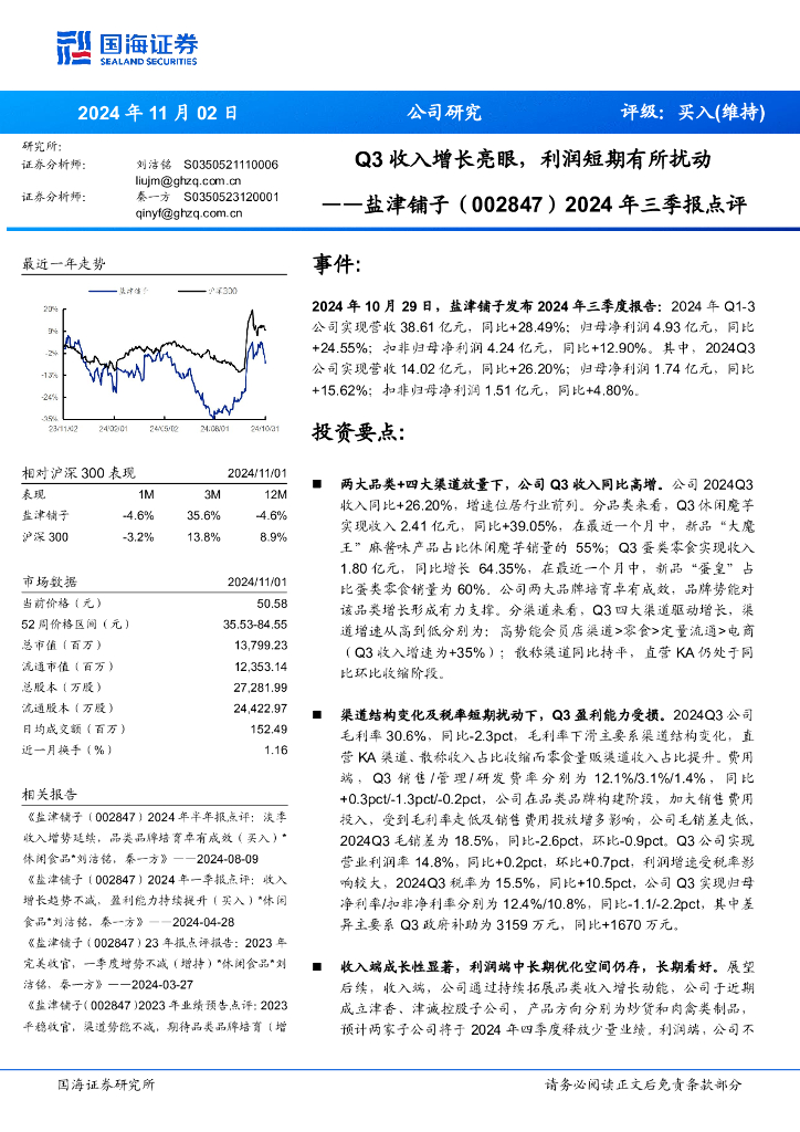 国海证券:盐津铺子(002847)-2024年三季报点评:Q3收入增长亮眼,利润短期有所扰动.pdf