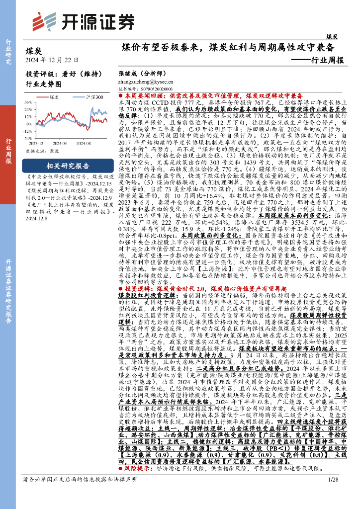 开源证券:煤炭行业周报:煤价有望否极泰来,煤炭红利与周期属性攻守兼备行业周报.pdf