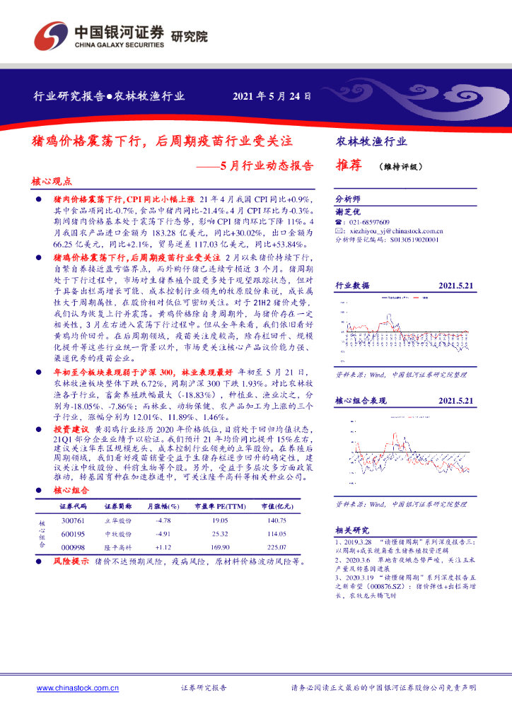 中国银河:农林牧渔行业5月动态报告:猪鸡价格震荡下行,后周期疫苗行业受关注.pdf
