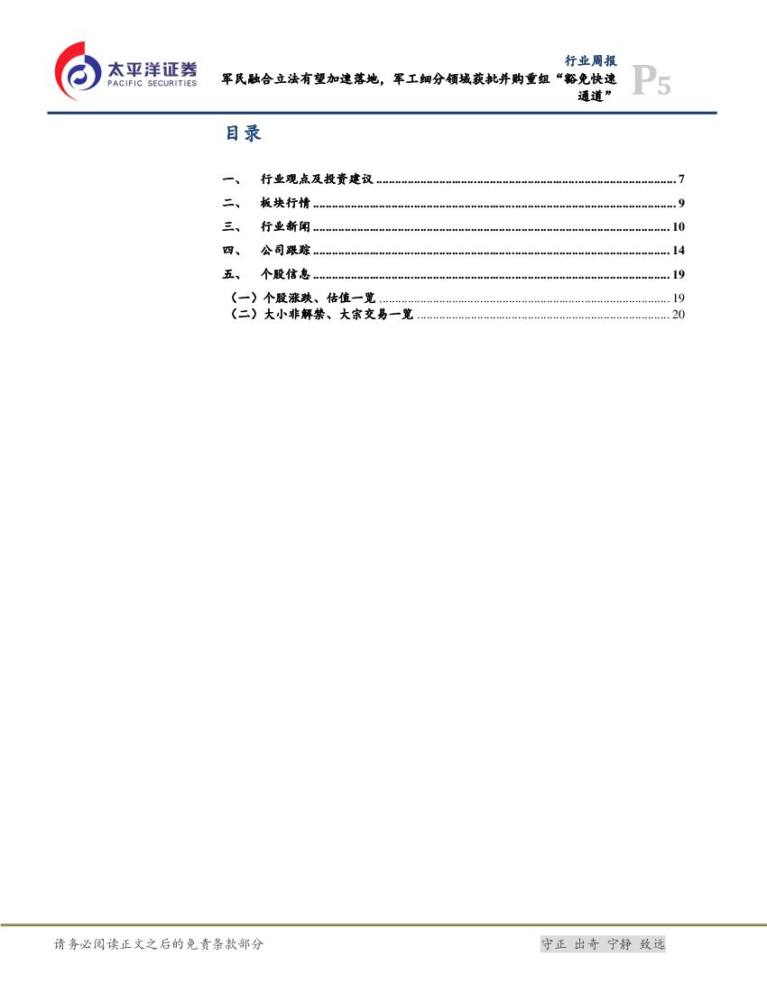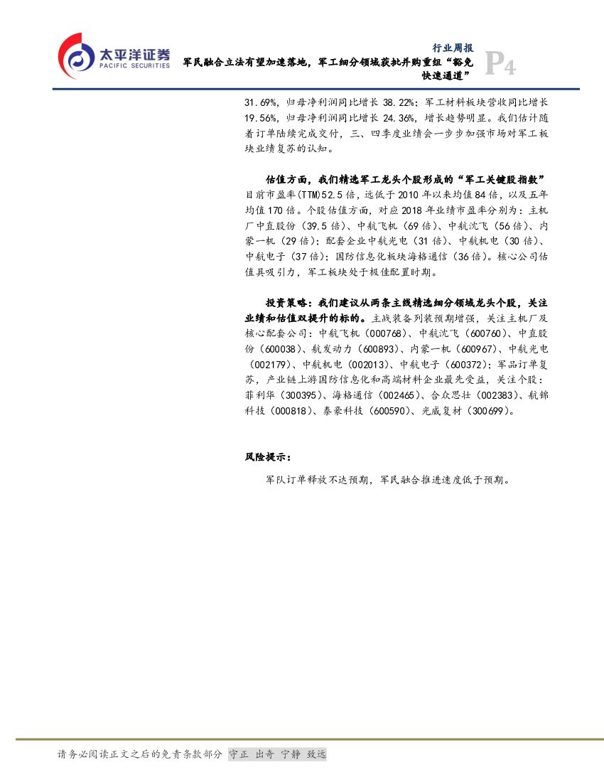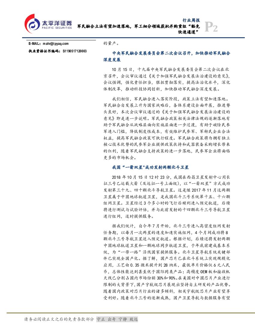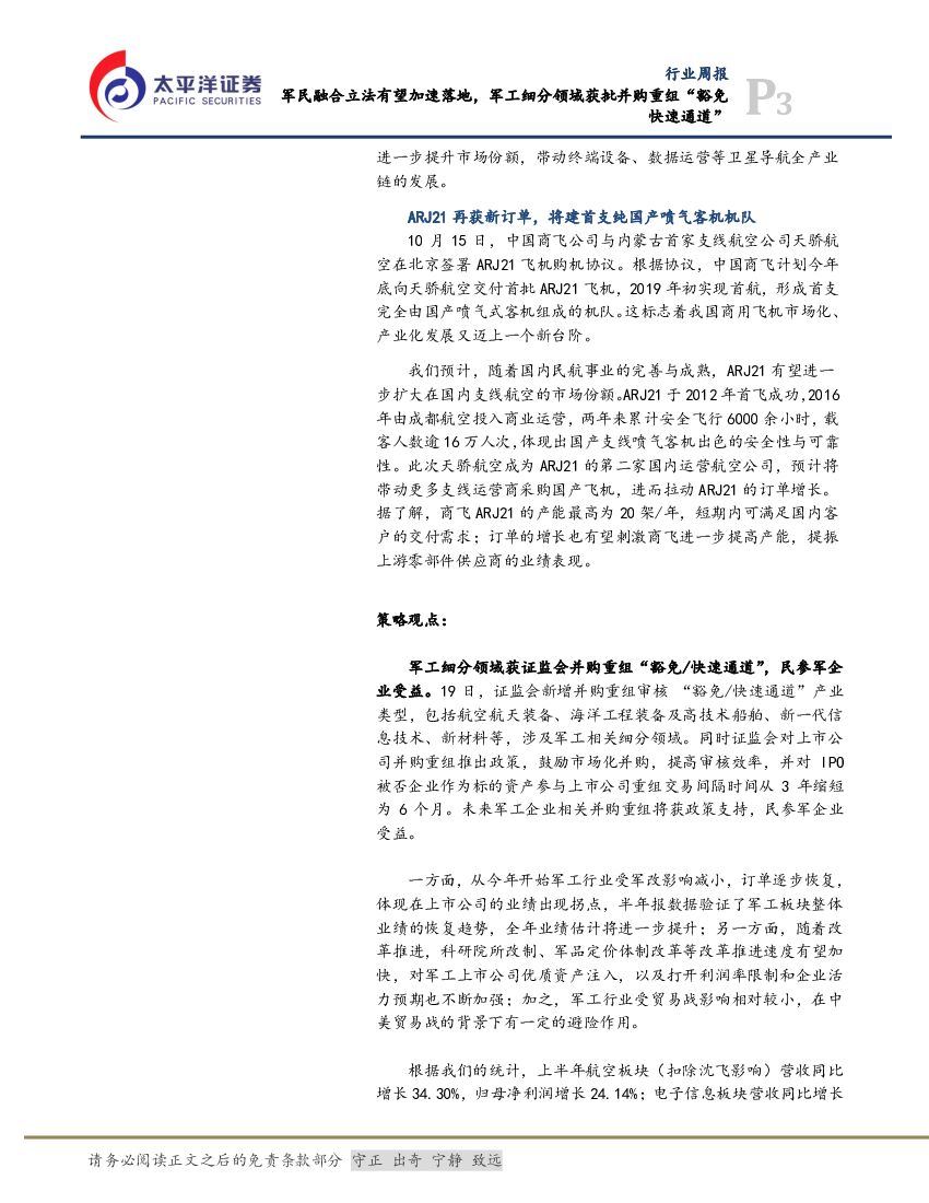 太平洋证券:航空航天与国防Ⅲ行业周报:军民融合立法有望加速落地,军工细分领域获批并购重组“豁免快速通道”.pdf