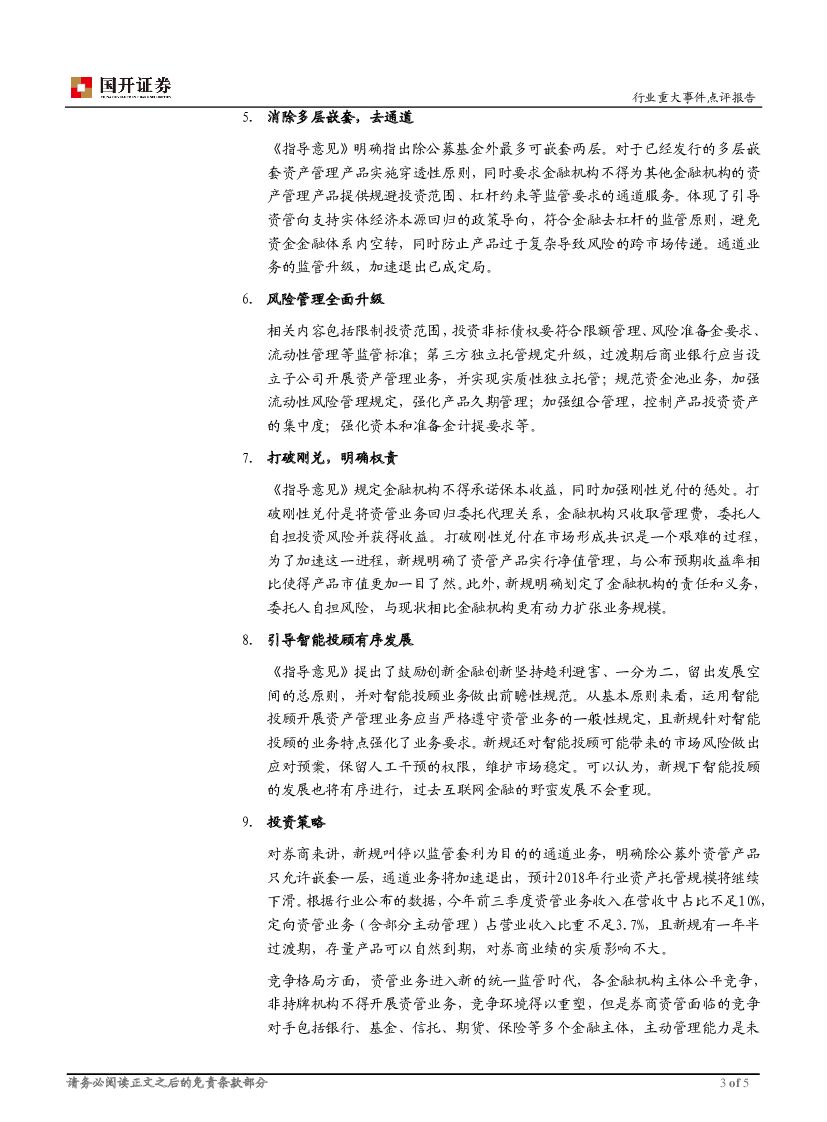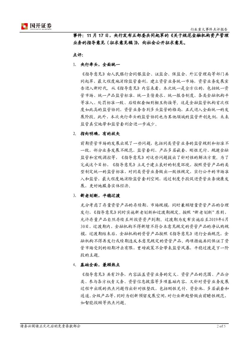 国开证券:证券:《关于规范金融机构资产管理业务的指导意见(征求意见稿)》点评-迎接统一新时代 券商业绩影响有限.pdf