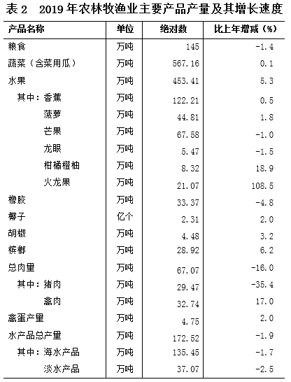 全年全省农林牧渔业增加值1119.07亿元,比上年增长2.7%。从内部行业看,农业增加值531.36亿元,比上年增长5.4%。粮食播种面积409.18万亩,比上年下降4.7%;产量145万吨,比上年下降1.4%。蔬菜(含菜用瓜)收获面积384.60万亩,比上年下降0.5%;产量567.16万吨,比上年增长0.1%。水果收获面积277.85万亩,比上年增长1.2%;产量453.41万吨,比上年增长5.3%。林业增加值70.74亿元,比上年增长5.5%。橡胶产量33.37万吨,比上年下降4.8%。牧业增加值191.67亿元,比上年下降6.5%。总肉量67.07万吨,比上年下降16.0%。渔业增加值286.59亿元,比上年增长0.7%。水产品总产量172.52万吨,比上年下降1.9%。农林牧渔专业及辅助性活动增加值38.71亿元,比上年增长10.3%。农林牧渔业主要产品产量及其增长速度见表2。