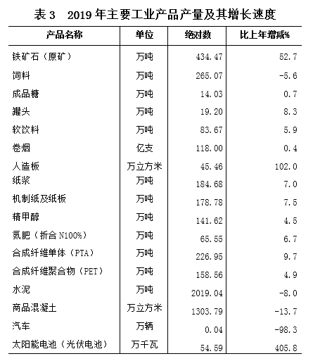 在八大工业支柱行业增加值中,农副食品加工业下降1.9%,造纸及纸制品业增长4.3%,石油加工业增长4.2%,化学原料和化学制品制造业增长5.4%,医药制造业增长6.9%,非金属矿物制品业下降11.0%,汽车制造业下降64.1%,电力、热力的生产和供应业增长12.2%。主要工业产品产量及其增长速度见表3。