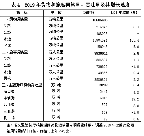 全年货物运输量1.86亿吨。货物运输周转量1668.54亿吨公里,其中水运周转量1590.46亿吨公里。全年主要港口货物吞吐量1.92亿吨,比上年增长8.4%,其中海口港1.24亿吨,增长4.8%;洋浦港5015.03万吨,增长19.2%;八所港1506.96万吨,增长8.0%。