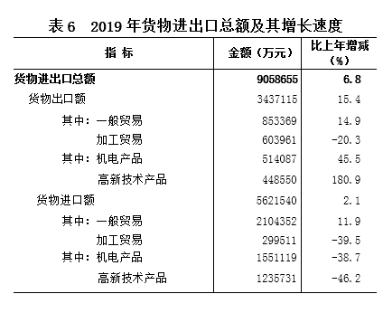 全年货物进出口总额905.87亿元,比上年增长6.8%。其中,出口343.71亿元,增长15.4%;进口562.15亿元,增长2.1%。货物进出口逆差218.44亿元,比上年减少34.21亿元。对“一带一路”沿线国家进出口总额352.29亿元,比上年增长10.6%,占货物进出口总值的38.9%。其中,对东盟进出口277.69亿元,增长42.3%,占30.7%。