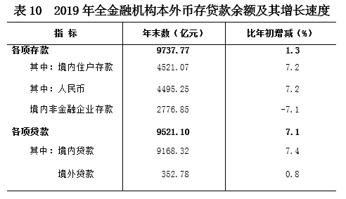 年末全省金融机构本外币存款余额9737.77亿元,比年初增长1.3%。年末金融机构本外币贷款余额9521.10亿元,比年初增长7.1%。其中,住户贷款2852.39亿元,增长13.1%;非金融企业及机关团体贷款6295.93亿元,增长4.7%。