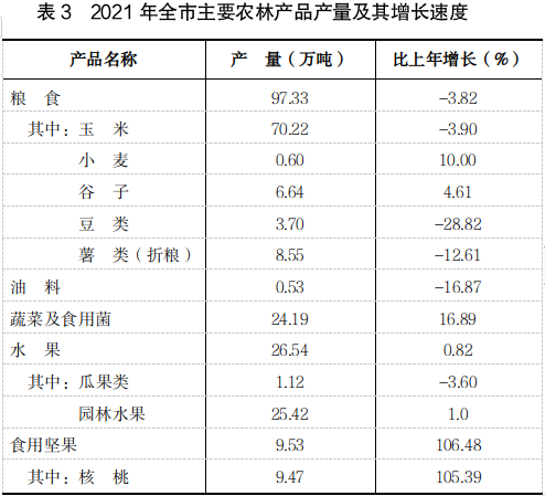 全年全市农作物种植面积355.28千公顷,比上年增加4.73千公顷。其中,粮食种植面积330.59千公顷,增加0.45千公顷;油料种植面积5.35千公顷,减少0.57千公顷;蔬菜种植面积10千公顷,增加1.26千公顷。在粮食种植面积中,玉米种植面积171.26千公顷,增加2.1千公顷;小麦种植面积1.95千公顷,增加0.04千公顷。果园面积58.77千公顷,增加8.33千公顷。