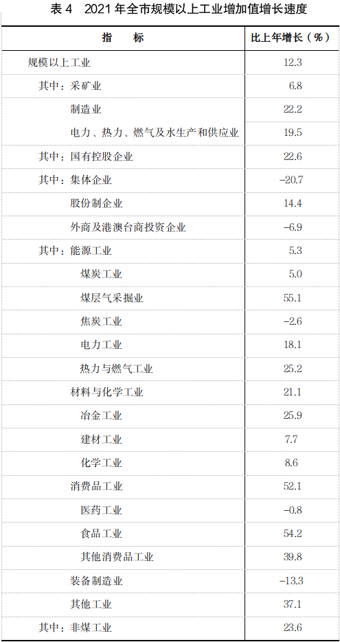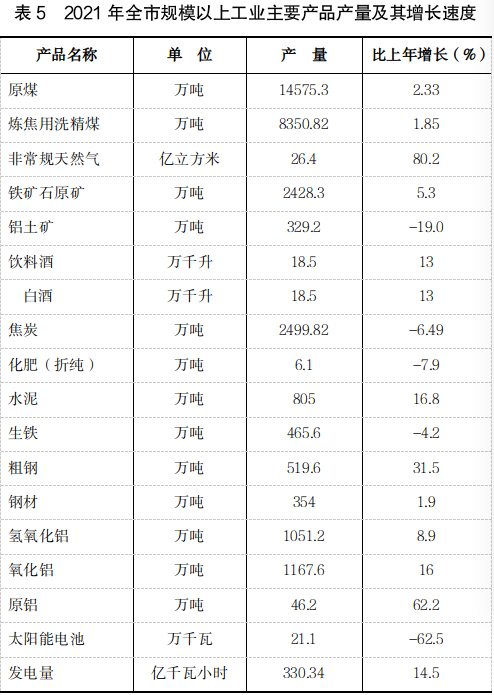 从产品产量看,全年全市规模以上工业企业原煤产量14575.3万吨,增长2.33%;焦炭产量2499.82万吨,下降6.49%;白酒产量18.5万千升,增长13%;钢材产量354万吨,增长1.9%;氧化铝产量1167.6万吨,增长16%;发电量330.34亿千瓦小时,增长14.5%。