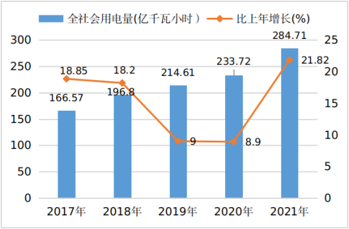 全年全市全社会用电总量284.7亿千瓦小时,其中,第一产业用电量2.3亿千瓦小时,增长18.26%;第二产业用电量235.1亿千瓦小时,增长25.55%,第二产业中,工业用电量231.7亿千瓦小时,增长25.59%;第三产业用电量25.1亿千瓦小时,增长5.25%;城乡居民生活用电量22.2亿千瓦小时,增长7.48%。