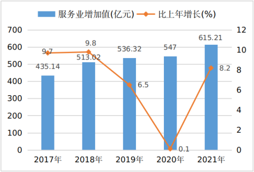 全年全市服务业增加值615.21亿元,按不变价格计算,比上年增长8.2%。其中,批发和零售业增加值95.93亿元,增长6.7%;交通运输、仓储和邮政业增加值81.44亿元,增长7.2%;住宿和餐饮业增加值15.26亿元,增长17.7%;金融业增加值82.48亿元,增长6.1%;房地产业增加值65.8亿元,增长8.1%。