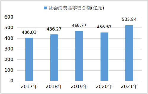 全年全市社会消费品零售总额525.8亿元,比上年增长15.2%。按经营地统计,城镇消费品零售额406.2亿元,增长14.9%;乡村消费品零售额119.7亿元,增长16.1%。按消费形态统计,商品零售额476.9亿元,增长14%;餐饮收入额48.9亿元,增长28%。